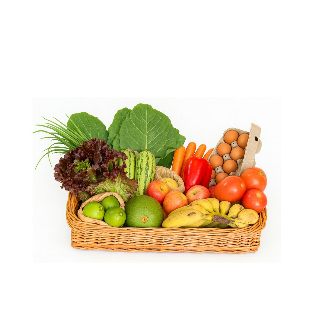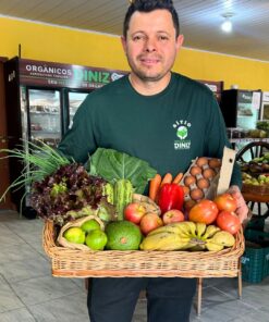 Contém: 500g de tomate, 1kg de banana, 500g de maçã, maracuja, 500g de limão, 1 manga, 500g de cenoura, 1 pimentões vermelhos, 500g de batata, 500g de abobrinha italiana, 1 maço de brócolis chinês, 1 maço de couve, 1 maço de cebolinha, 1 alface e 1 dúzia de ovos caipiras orgânicos.